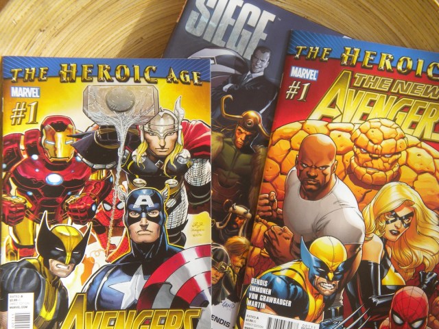 Algún trapito y, por supuesto, cómics fueron otras compras, pero como veis nada del otro mundo, que la crisis es la crisis y hay que ahorrar. Con respecto a los cómics mi elección se centró en los Vengadores. Iba a hacer el típico “Anoche…” pero al tratarse de cómics que no se han publicado aún en España, no quiero romper la sorpresa de quienes quieran leerlos. The Siege, se está empezando a publicar en España bajo el nombre de Asedio y no defraudará a los seguidores Marvel. En cuanto a las colecciones Avengers y New Avengers, que tienen el anagrama Heroic Age y que cuentan acontecimientos inmediatamente posteriores a la historia antes comentada, recuperan la luminosidad de los héroes tras una época de oscuridad con historias que pintan muy bien pero con una pega… ¿Por qué esa necesidad de sobreexplotar a los personajes de Spiderman y Lobezno, ambos miembros de dos grupos de Vengadores a la vez? No os canso más que sé que los cómics no son del gusto de todos aunque me parece que están muy de moda viendo lo presentes que están en medios de comunicación.