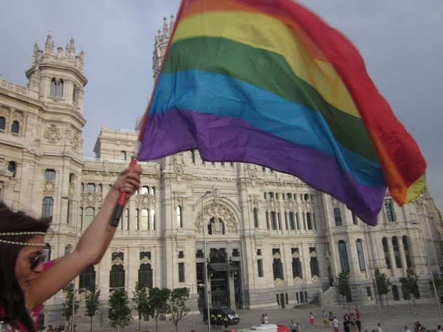 Y el sábado llego la marcha, el acontecimiento más importante de estas fiestas. Como todos los años recorrió un trayecto que va desde la puerta de Alcalá hasta Plaza de España. A mí me gusta esta fiesta pero no estoy de acuerdo en su politización ni en las consignas en contra de otros colectivos, sencillamente porque no me parecen acordes a la realidad y lo que se trata es de reivindiar pasandolo bien, no atacando o insultando. Este año lo he visto como un privilegiado, gracias Javi, y he podido sacar algunas fotos para compartir con vosotros.