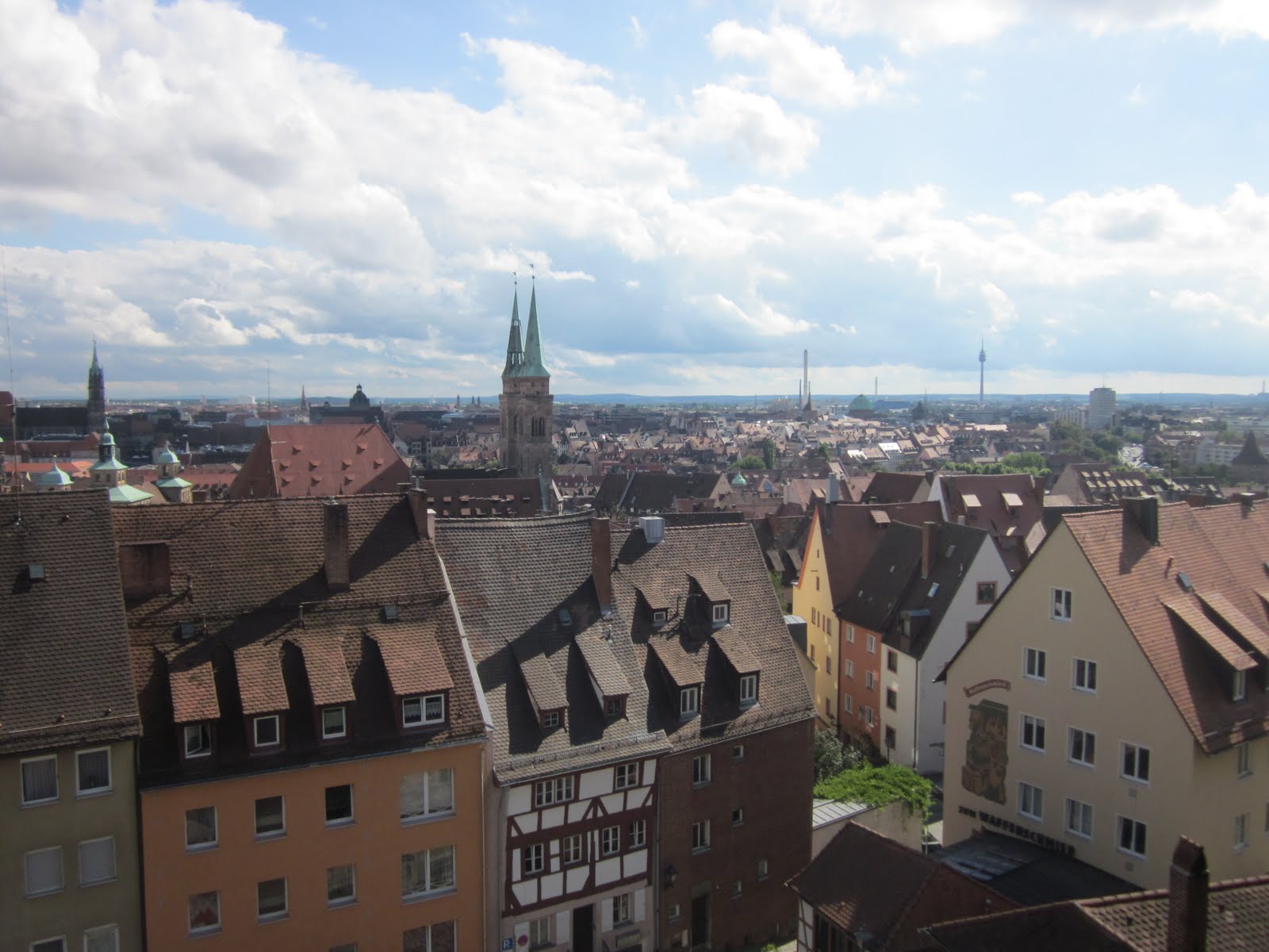 Enclavada dentro de una espectacular muralla, encontramos también la típica postal alemana de pueblo medieval pero en formato grande. La fortaleza militar del Burg es el monumento más importante de la ciudad, a la que domina desde lo alto. Es absolutamente necesario subir para poder observar una privilegiada vista panorámica. Muy cerca de allí hemos pasado por la casa en la que vivió el pintor Albrecht Düder (Durero) y por la iglesia dedicada a St. Sebald, de estilo románico tardío (aunque yo hubiera jurado que era gótico).
