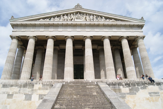 A unos 12 kilómetros de allí se encuentra algo realmente sorprendente. En Donaustauf, un pequeño pueblo, hay a la orilla del Danubio una especie de templo griego (estilo dórico) que fue edificado a petición del rey Luis de Baviera para honrar a los grandes personajes alemanes. Recibe el nombre de Walhalla, que (que bueno ser lector de cómics) es el lugar donde residen los héroes muertos de la mitología nórdica. Ya que pasábamos por allí merecía la pena desviarse unos kilómetros para observar el templo. Lástima que unos andamios hayan impedido lo que parecía una foto espectacular.