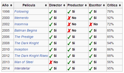 El reparto es muy solvente, de eso no cabe duda. ¿La recomendaría? Pues vista la polémica que leo en las redes sociales, prefiero quedarme con eso de “A mí me gustó, pero, aviso, dura tres horas” y que cada uno decida. No tengo problemas con la duración de las películas, ya que las hay terribles de 85 minutos, pero os aseguro que las 3 horas no se me hicieron en absoluto pesadas. Me han entrado muchas ganas de revisar la filmografía de Nolan y para hacerlo he tomado como referencia este cuadro de la Wikipedia: