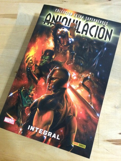 Un tomazo que contiene una saga que una de las webs de referencia de los cómics de superhéroes considera una de los 10 mejores eventos publicados por Marvel Cómics. Este fin de semana he empezado a leérmelo acompañado de buena música. Mi cara debió ser un poema. Tanto me emocioné que hasta colgué una foto en un grupo de Facebook posando con el libro que recibió 29 “me gusta” de gente que no conozco de nada pero estoy encantado de formar parte de una comunidad que qué, como yo, ya no tiene que avergonzarse de leer historias de gente vestida con mallas de colores. ¡larga vida a la Mazmorra de Lavteria!
