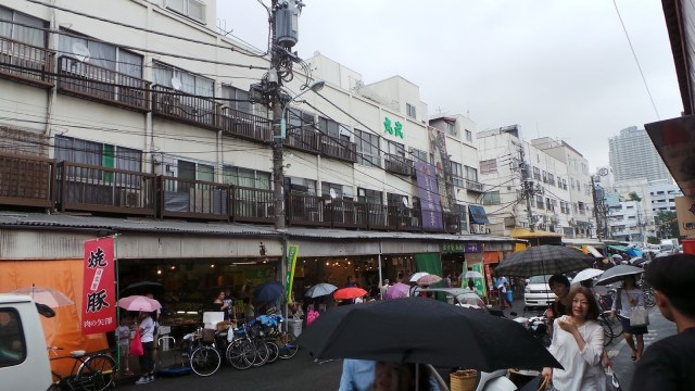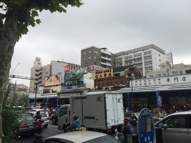 Un atún gigante nos anunció que ya estábamos en Tsukiji. El tráfico lleno de pequeños utilitarios, motos y furgonetas, el día gris y lluvioso, los puestos pegados unos a otros, llenos de luz y pescado me trasladaron a mi, cinefilo como soy, a un ambiente totalmente cercano al de Blade Runner. Faltaban la música de Vangelis y la apostura de Harrison Ford en aquella película.