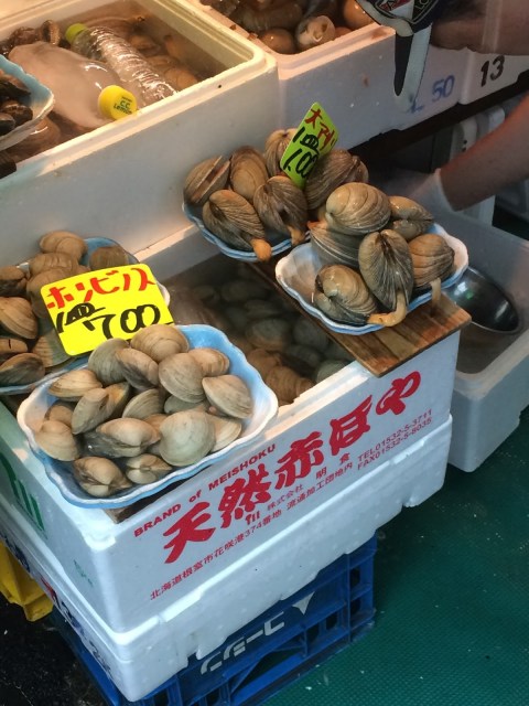 Los ojos de los 6, y eso que acabábamos de desayunar, se nos abrieron como platos al ver lo que se ofrecía en los puestos que están justamente delante de la lonja donde se comercializa el producto. Cientos de puestos, unos pegados a otros en las que vimos cosas que difícilmente veremos en otro mercado del mundo. Mi creciente preferencia según pasan los años hacia el pescado sobre la carne, me tuvieron alerta todo momento y hasta tuve ganas, sin hambre, de probar las cosas que se me ofrecían. Por cierto, Japón es el país más limpio en el que he estado, puedes comer en el suelo, de verdad, es de una limpieza exagerada. Tokio es una ciudad de 13 millones de habitantes y ya quisiera mi adorada Madrid, con solo 3, estar la mitad de aseada. El mercado, con todo lo cochambroso que parece ser en las fotos, no era una excepción.