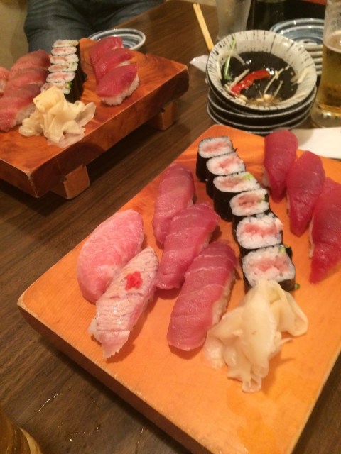 Insisto en que tanto nos gustó el lugar que hicimos tiempo pateando la ciudad para volver a comer allí, y vaya si comimos. Volvimos a experimentar eso de subir a un segundo piso para ver que se nos ofrecía y encontramos un pequeño restaurante con poquitas mesas en el que, como ya habíamos hecho otras veces, tuvimos que quitarnos el calzado y sentarnos a la japonesa sobre un tatami. El restaurante era el A-B-C de lo que entendemos por cultura culinaria del Japón. Sencillo, sin apenas decoración, con espacios reducidos, silencio y aspecto espartano pero delicado a la vez. Después de 10 días en Japón pudimos probar por primera vez un SUSHI, así, en mayúsculas.