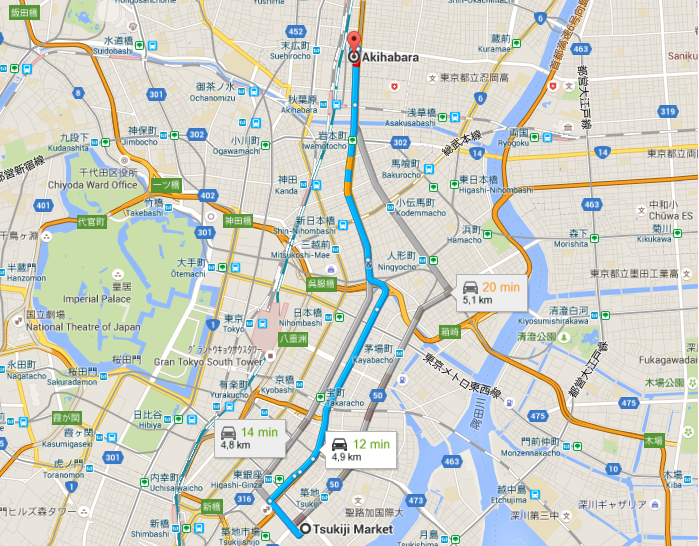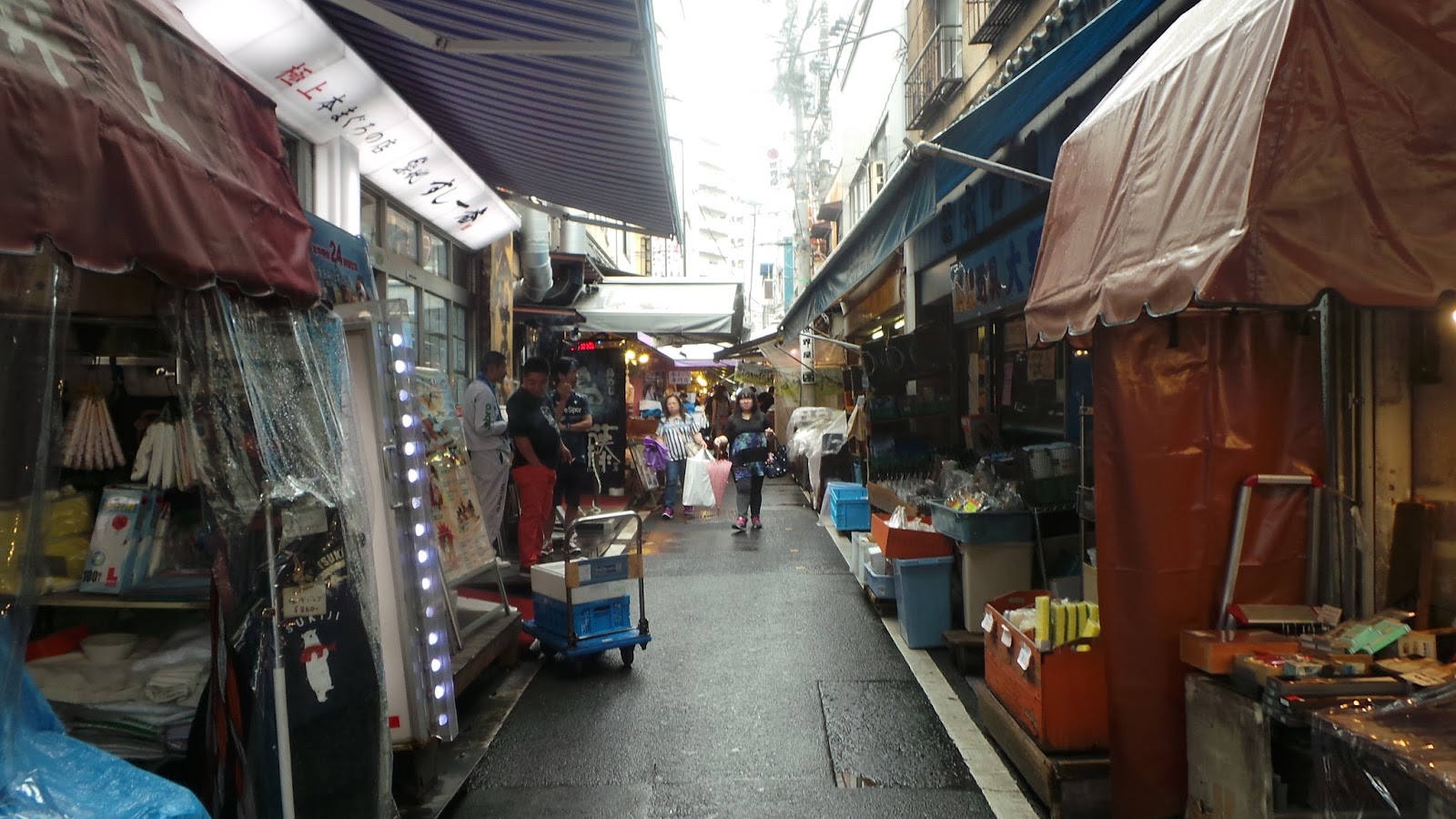 Un atún gigante nos anunció que ya estábamos en Tsukiji. El tráfico lleno de pequeños utilitarios, motos y furgonetas, el día gris y lluvioso, los puestos pegados unos a otros, llenos de luz y pescado me trasladaron a mi, cinefilo como soy, a un ambiente totalmente cercano al de Blade Runner. Faltaban la música de Vangelis y la apostura de Harrison Ford en aquella película.