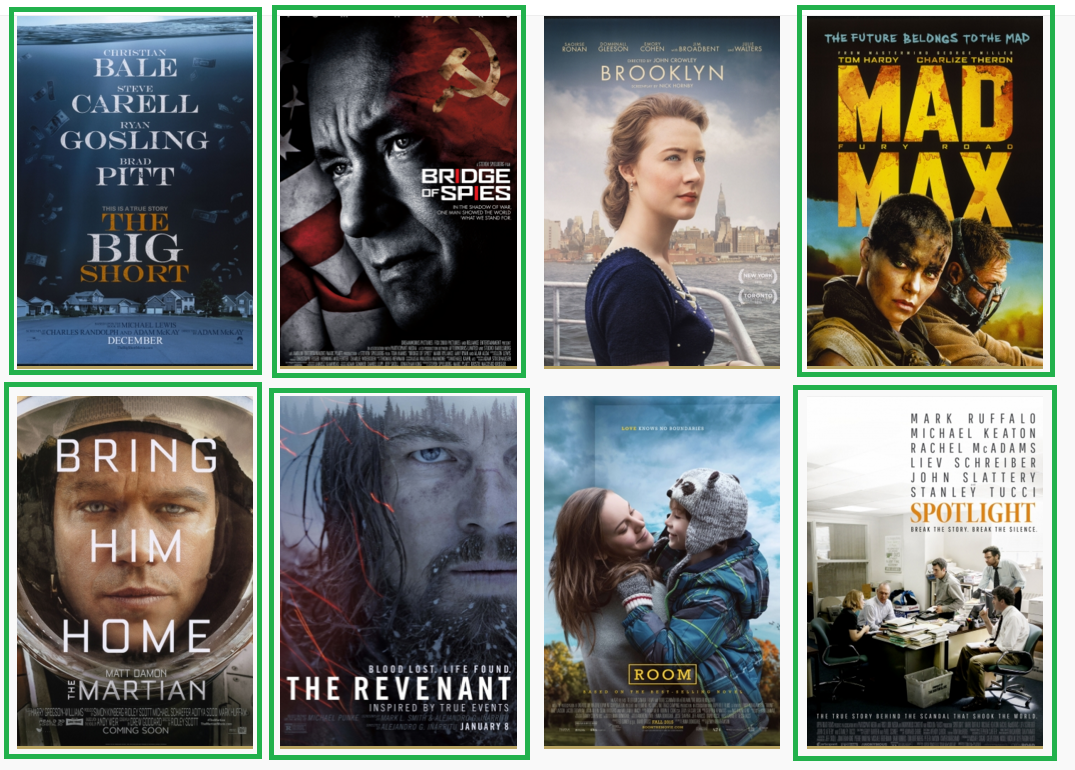 De momento no pierdo las costumbres, ya he visto 6 de las 8 nominadas al Premio Oscar a la mejor película. Brooklyn y La Habitación no se han estrenado aún en nuestro país pero de las 6 restantes puedo decir que…¡Vaya nivelazo tenemos este año! Todas las vistas son merecedoras de estar incluidas entre las favoritas pero para mi la lista debió cerrarse en 10, incluyendo a las magníficas Carol y Del Revés (Insidse Out). Me voy a mojar con el orden de preferencia aunque es cierto que todas me han gustado bastante. Por ahora la cosa va así:
