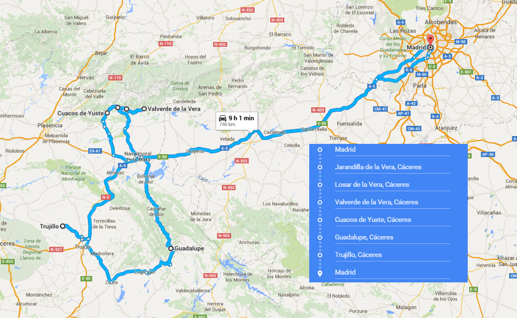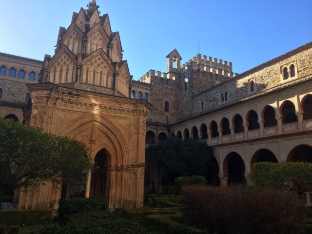Se encuentra justo enfrente del Monasterio de Guadalupe, que nada tiene que ver con el de Yuste. En absoluto es austero, como el anterior, y atesora muchísimas obras de arte entre las que hay un impresionante museo de bordados, colección de libros de oración y pinturas de Zurbarán, El Greco o Goya. Impresionante edificio en el que se aprecian todos los corrientes que se dieron entre los siglos XIII y XVIII (Gótico, mudéjar, renacentista, barroco y neoclásico), fue declarado Patrimonio de la Unesco en 1993 y solo se puede visitar acompañado por un guía o un fraile, según sea la instancia que se visita.