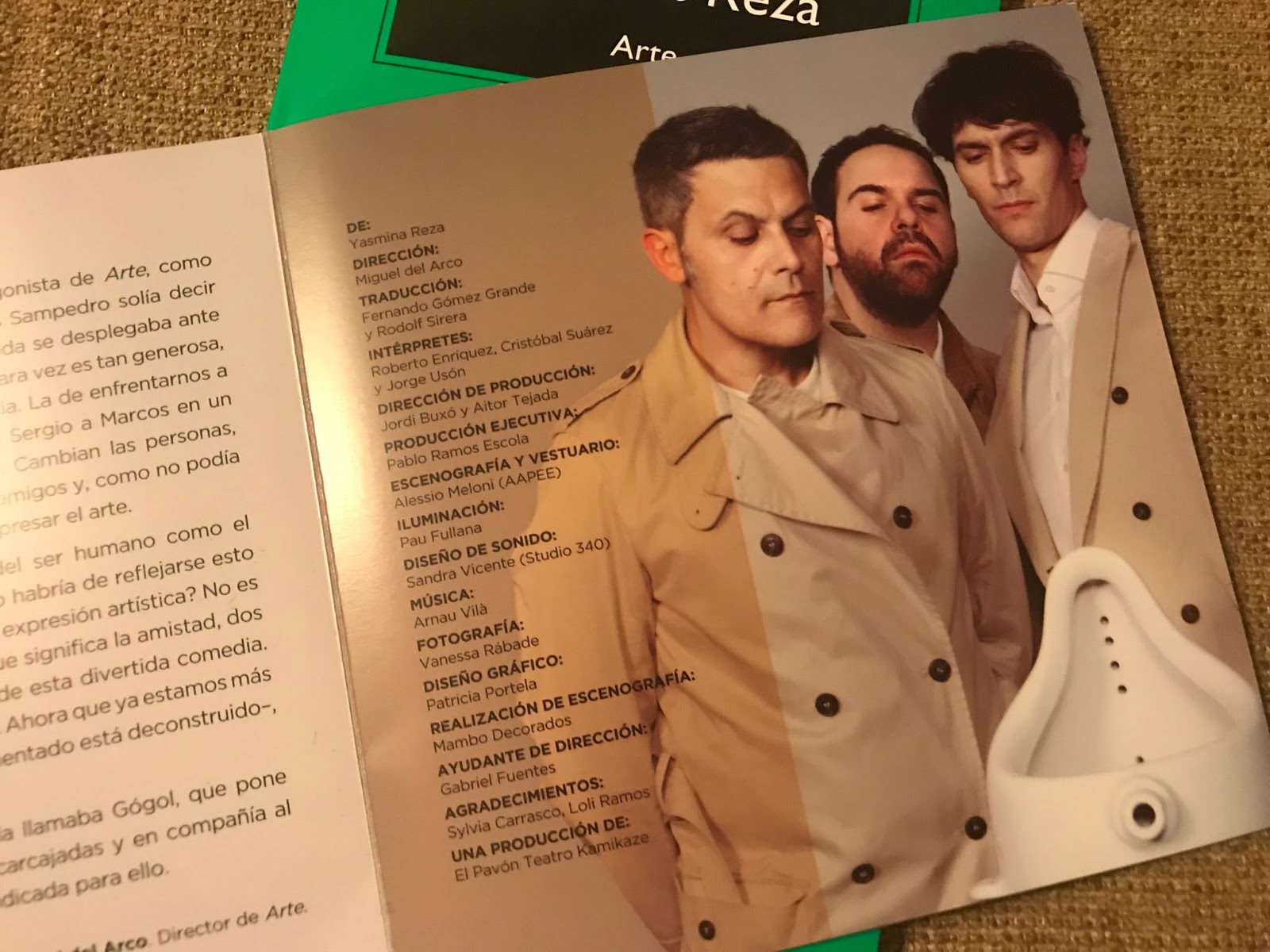 Arte es una conocida obra de teatro de 1994 que se lleva representando desde entonces con regularidad y siempre con éxito. En 1998 se estrenó en el Teatro Marquina de Madrid una versión antológica, según los que la vieron, con los grandísimos Carlos Hipólito, José María Pou y José María Flotats que a su vez era el director. Se volvió a representar en 2009 y en 2010 y ahora 7 años después son Roberto Enriquez (Marcos), Cristóbal Suarez (Sergio) y Jorge Usón (Iván) quienes recogen el testigo para volver a poner sobre las tablas esta historia de tres amigos y un cuadro blanco.