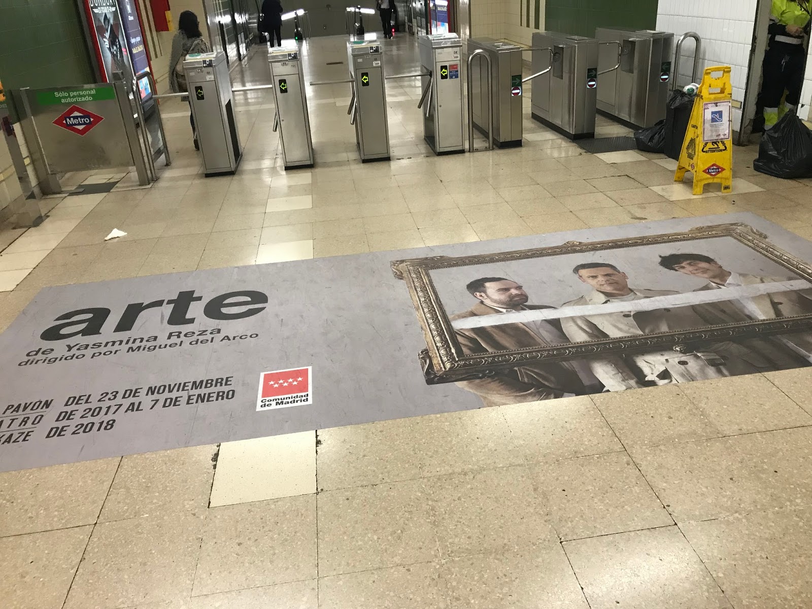 Estas últimas mañanas me encuentro con estos tres amigos en el suelo de la salida del Metro de Avenida de América por la calle Pedro de Valdivia. Ya estuve viendo, y así lo escribí en esta nueva etapa de mi blog, Smoking Room en el Teatro Pavón Kamikaze y el viernes 24 repetí en el mismo lugar para disfrutar de una nueva producción de Arte, de Yasmine Reza.