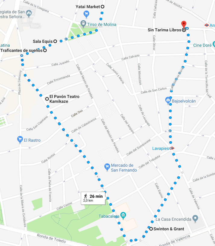 Genial paseo cultural desde el Yatai Market hasta Sin Tarima Libros, pasando por la Sala Equis, Traficantes de sueños, Swinton & Grant y Bajo el Volcan. Todos lugares que me chiflan. Si entráis en alguno comentadle: ¿Sabéis? un tal Maxi está entusiasmado con este lugar.