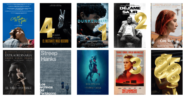 Todas estrenadas excepto: Call Me by Your Name ( 26/01/2018), El hilo invisible ( 02/02/18), La forma del agua (16/02/18) y Lady Bird (13/04/18) aunque bien podrían, en el caso de la última, adelantar su estreno por eso se aprovechar el tirón que suponen una nominaciones que pueden no acabar en premio.