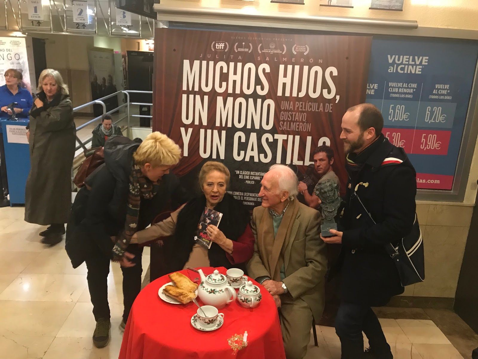 A la salida, mientras comentábamos lo que acabábamos de ver, nos topamos con el equipo, Goya incluido, de Muchos hijos un mono y un castillo. Allí estaba Gustavo Salmerón dando protagonismo a sus padres que posaban sonrientes con aquellos que pedían foto y sujetar el premio ganado el fin de semana pasado. Simpatiquísimos la verdad, no se puede hacer mejor promoción de una película documental que tengo muchas ganas (espero hacerlo pronto) de ver.