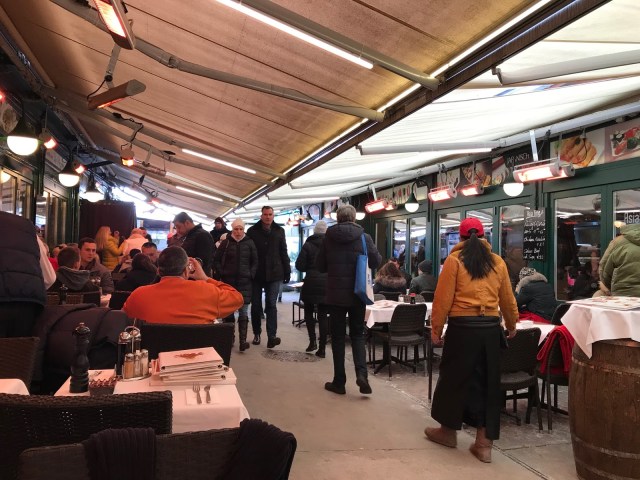 Por la tarde teníamos evento operístico así que nos volvimos al mercado que habíamos conocido el día anterior para degustar uno de los platos típicos : un Wiener Schnitzel, que no es más que un filete de pollo, cerdo o ternera empanado y acompañado con patatas fritas. Nos atendió, como suele ser habitual en esto sitios que tienen algo de turísticos, uno de esos simpáticos chicos de nacionalidad indefinida que habla todos , y cuando digo todos son TODOS, los idiomas.