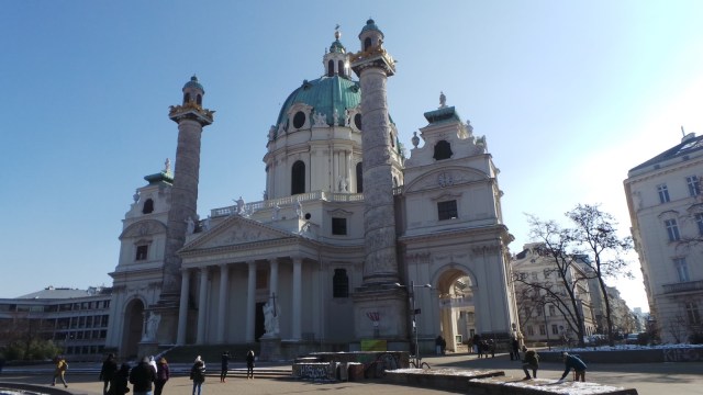 A la 13.00 teníamos la primera visita cultural programada así que antes paramos a reponer fuerzas, un café calentito, en un lugar de inspiración latina lleno de encanto. El Café Mendez está justo enfrente de otra de las iglesias más famosas de la ciudad, la de San Carlos (Karlskirsche) y es un lugar estupendo para hacer una parada técnica y repasar lo visto y lo que queda por ver. En ese mismo lugar, Karlplatz, encontramos otro monumento dedicado a un compositor, en este caso es Brahms. La parada me sirvió para escribir en una libretita roja del tamaño de la palma de mi mano todo lo que estáis leyendo.