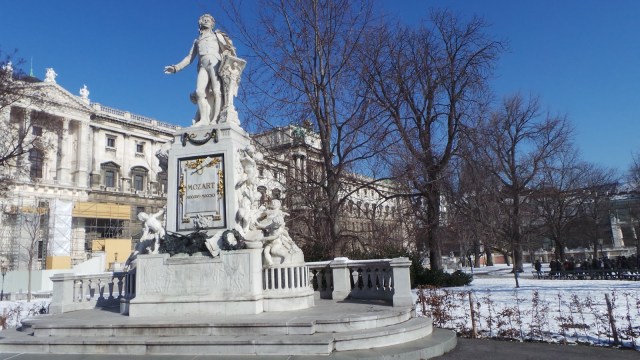 Nuestro sábado comenzó como terminan muchos de mis viernes laborarles en Madrid : En un Starbucks. Con temperaturas bajo cero, un sol espléndido y después de un latte gigante, nos dispusimos a recorrer la ciudad empezando en Mariahilfer, la calle más moderna según la guía (más comercial, se entiende) hasta llegar al monumento a Mozart en el Burggarten, uno de los muchos parques de la ciudad que deben brillar especialmente en primavera pero que estaban realmente bonitos llenos de nieve.