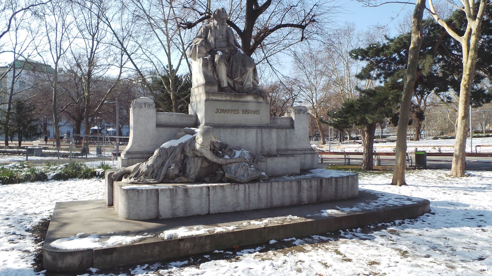A la 13.00 teníamos la primera visita cultural programada así que antes paramos a reponer fuerzas, un café calentito, en un lugar de inspiración latina lleno de encanto. El Café Mendez está justo enfrente de otra de las iglesias más famosas de la ciudad, la de San Carlos (Karlskirsche) y es un lugar estupendo para hacer una parada técnica y repasar lo visto y lo que queda por ver. En ese mismo lugar, Karlplatz, encontramos otro monumento dedicado a un compositor, en este caso es Brahms. La parada me sirvió para escribir en una libretita roja del tamaño de la palma de mi mano todo lo que estáis leyendo.