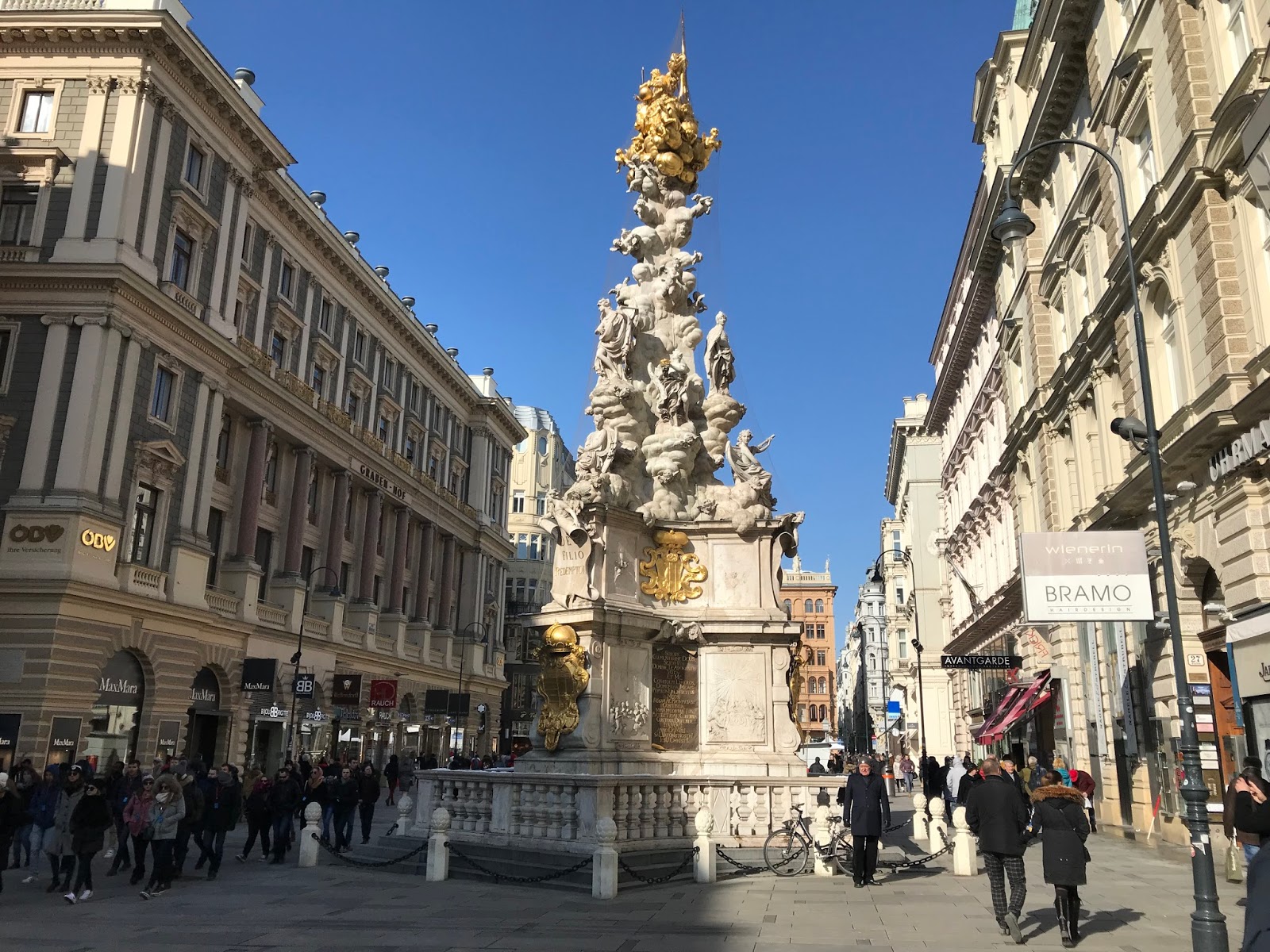Erigido entre 1683 y 1693 es una pieza de arte barroco de 21 metros de altura que se levantó después de la gran peste que asoló la ciudad por 1679 como resultado de una promesa para que finalizara. El monumento estaba rodeado de algunos (pocos) curiosos, nada que ver con la cola para entrar en al Apple Store que hay muy cerca de allí. No había, que yo sepa, ningún lanzamiento especial pero allí estaba la gente asistiendo al espectáculo que estaban dando los vendedores gritando y haciendo aspavientos. El lugar más animado que había visto hasta el momento.