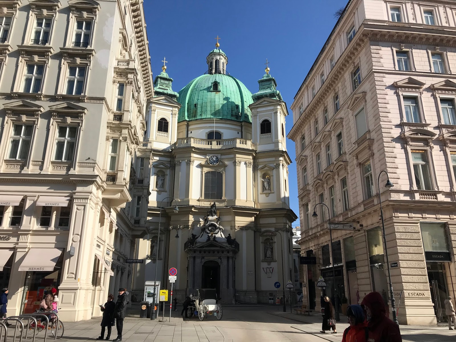 Entramos en la catedral (Stephansdom), dedicada a San Esteban, y comenté lo mucho que tienen que aprender de las nuestras en la forma en que son mostradas. En España cuando entras a una catedral no dejas de sentir que estás en un lugar que es sagrado para mucha gente y, creas o no, inspiran respeto. En esta de Austria no dejé de pensar en lo triste que es que algunas no parezcan más parques temáticos. Me dijeron que era por la hora pero la impresión que me llevé, mas allá de admitir su espectacular arquitectura gótica, fue bastante triste. Mucho más me impresionó la muy barroca iglesia de San Pedro (Peterskirsche), no muy lejos de allí.