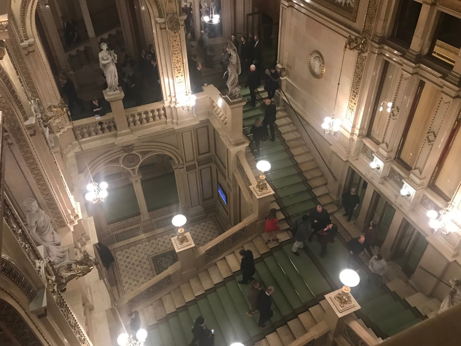 Aproveché cada uno de los descansos para perderme por el teatro y su salones, en los que es un autentico placer tomarse una copita de vino. El edifico que se abrió en 1869 y es de corte neorenacentista, como otros muchos en la ciudad, sufrió durante la II Guerra Mundial un bombardeo que obligo a un reconstrucción que lo ha dejado espléndido y convertido en una referencia mundial. Las fotos no hacen justicia a un lugar de esos a los que volvería una y otra vez sin cansarme jamás.