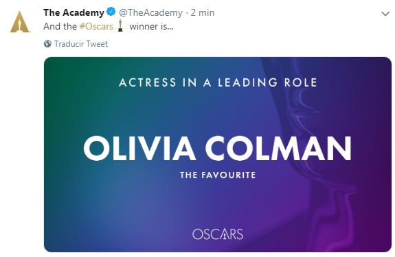 Olivia Colman le birla el Oscar a Glen Close y a Lady Gaga y salva los platos para La Favorita. Ha sido la sorpresa de la gala, pero es un premio muy merecido.