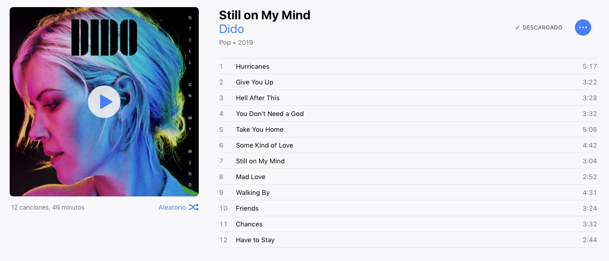 Confieso que, de no ser por la machacona insistencia de la mencionada emisora, no hubiese prestado atención a un disco que me está gustando mucho. Yo creo que aparecerá en muchas listas de lo mejor de año cuando lleguemos al momento de hacerlas. En cuanto a Dido, es Still on My Mind, un disco amable de esos con los que me gusta acabar los domingos mientras leo. La voz aterciopelada de la inglesa es una compañera ideal de momentos relajados. Todos recuerdan a Dido por Thank you y su colaboración con Eminem, pero la chica ha seguido trabajando, aunque han sido los medios independientes los que más ha seguido su carrera.