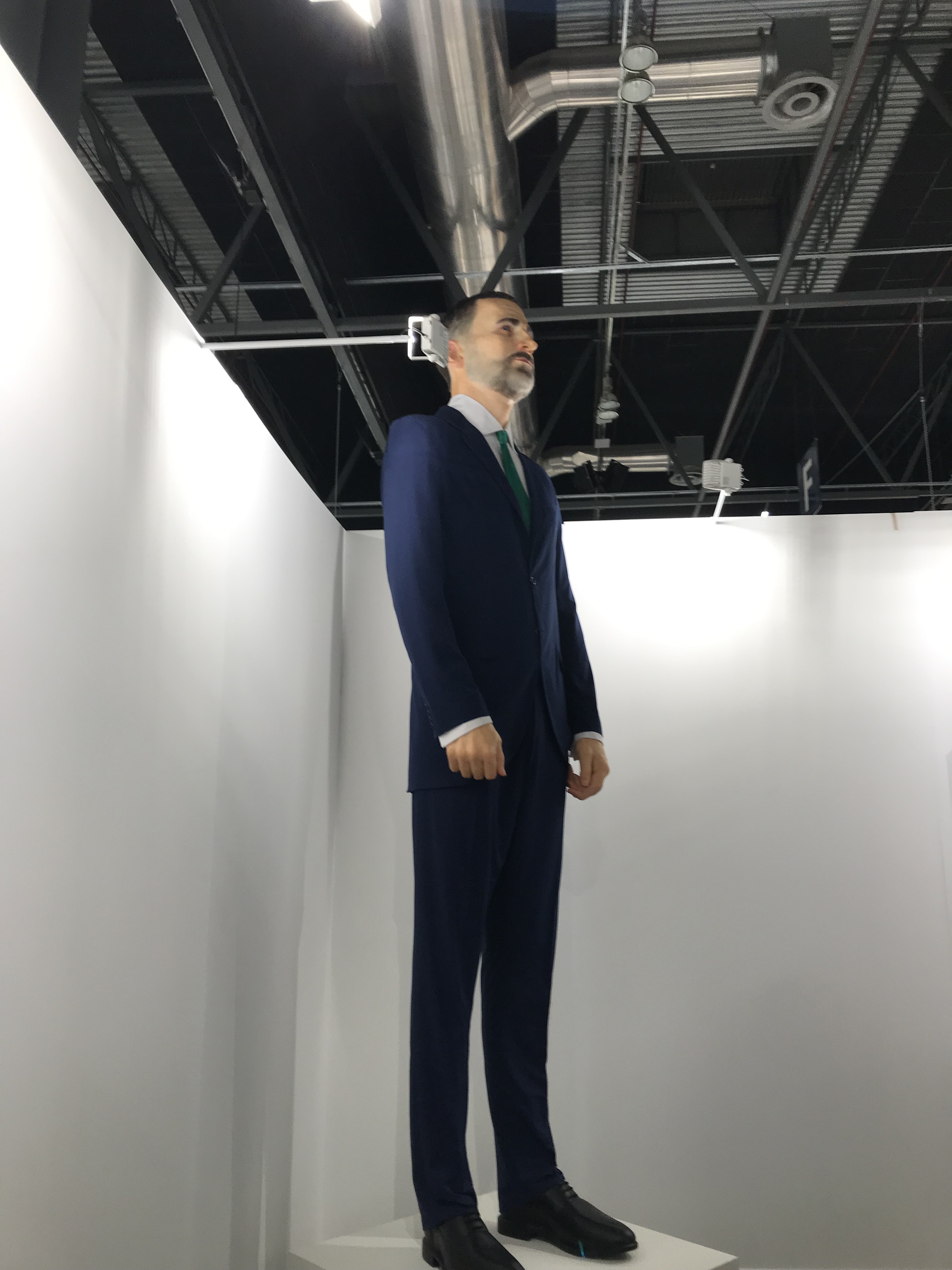No tardé mucho en encontrarme con la otra obra polémica de la feria, un ninot (escultura para quemar en las fallas) creado por Eugenio Merino y Santiago Sierra de más de 4 metros de altura del Rey que además de estar perfumado con el mismo perfume de Hugo Boss que le regaló la Reina Letizia, es una obra con fecha de caducidad: comprometía a quien lo comprase a quemarlo tras un año desde su adquisición.