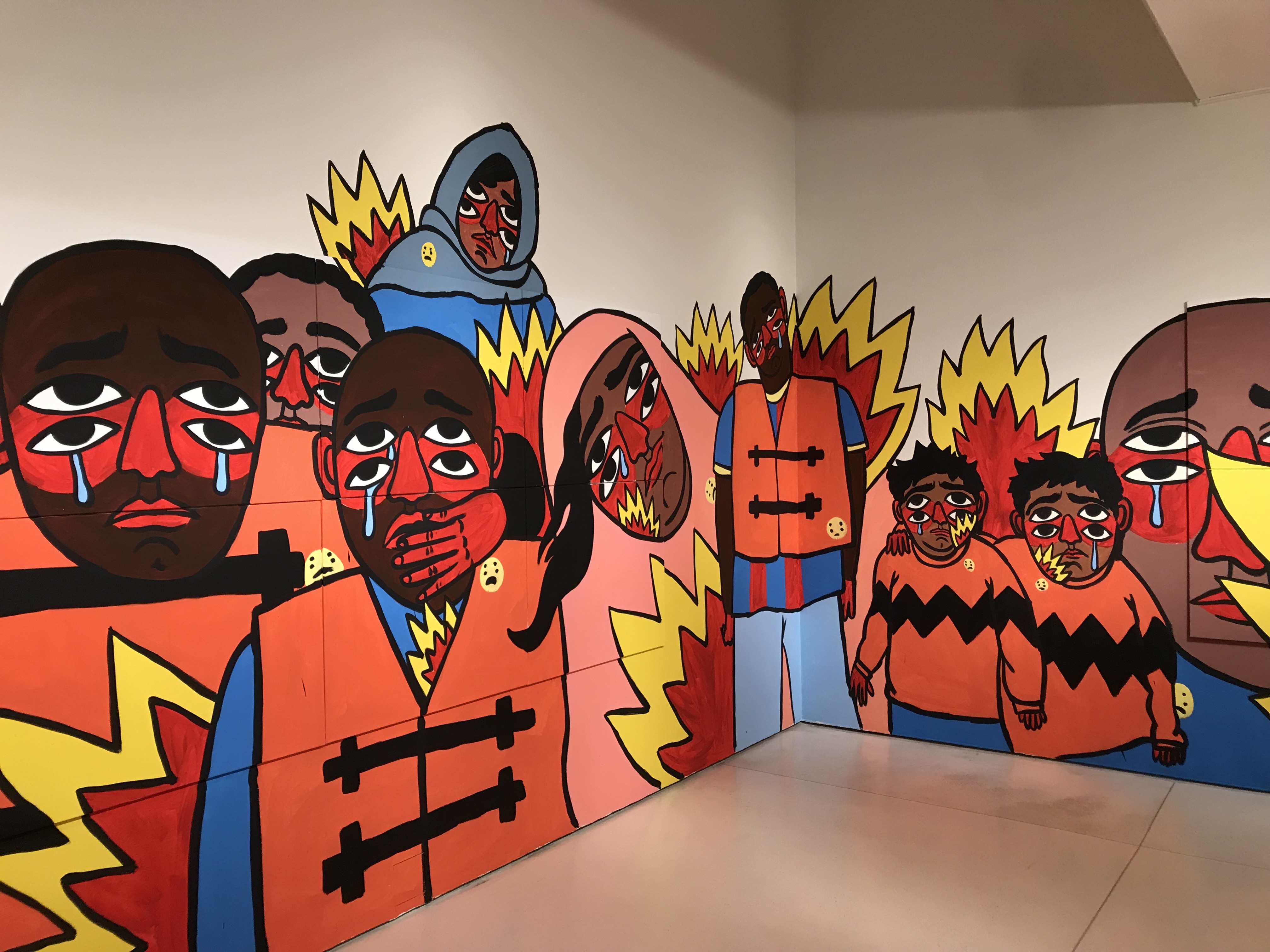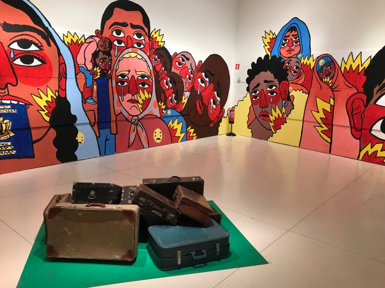 En el mismo recinto, en un salón contiguo encontramos una sala prácticamente diáfana con unas maletas viejas en el centro y cuyas paredes están completamente dibujadas por el ilustrador Ricardo Cavolo. Se trata de celebrar los 40 años de la necesaria Comisión Española de Ayuda al Refugiado. Una maravilla con conciencia social.