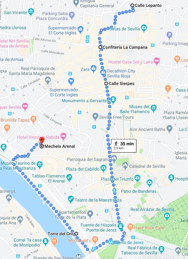 El AVE de las 17.00 horas llega a Sevilla a eso de las 19.40, una hora fantástica para dar un paseo por la ciudad, comprobar que todo queda en su sitio, que la Torre del Oro está como siempre y que el bullicio de un viernes tarde llena a la ciudad de vida. Con eso de hacer tiempo hasta la cena hicimos el camino desde la calle Lepanto, donde nos alojábamos hasta el restaurante Mechela, donde cenamos, andando en un tranquilo paseo, pasando por Campana, la calle Sierpes, la Plaza Nueva…hasta llegar a la zona del Arenal.