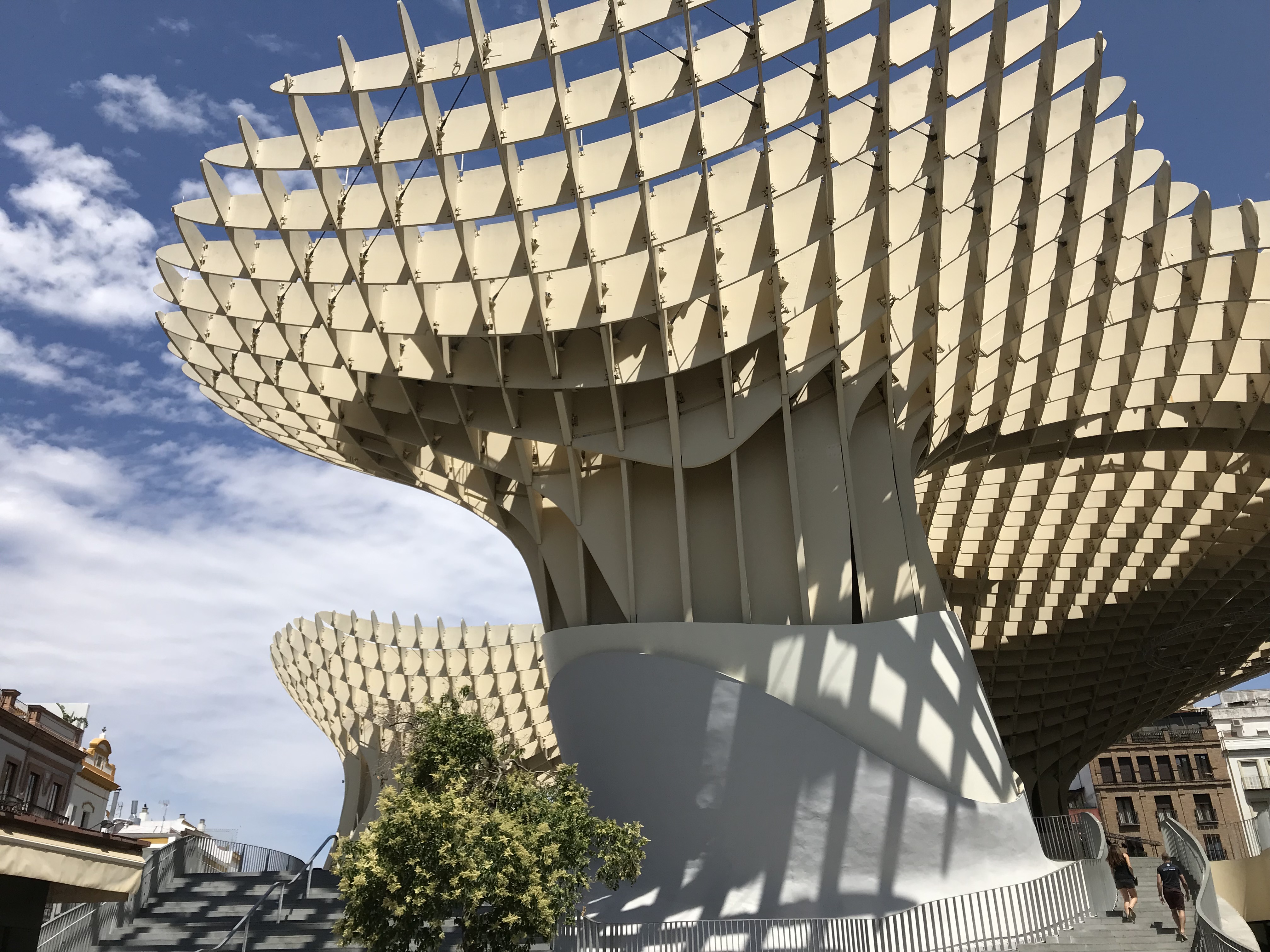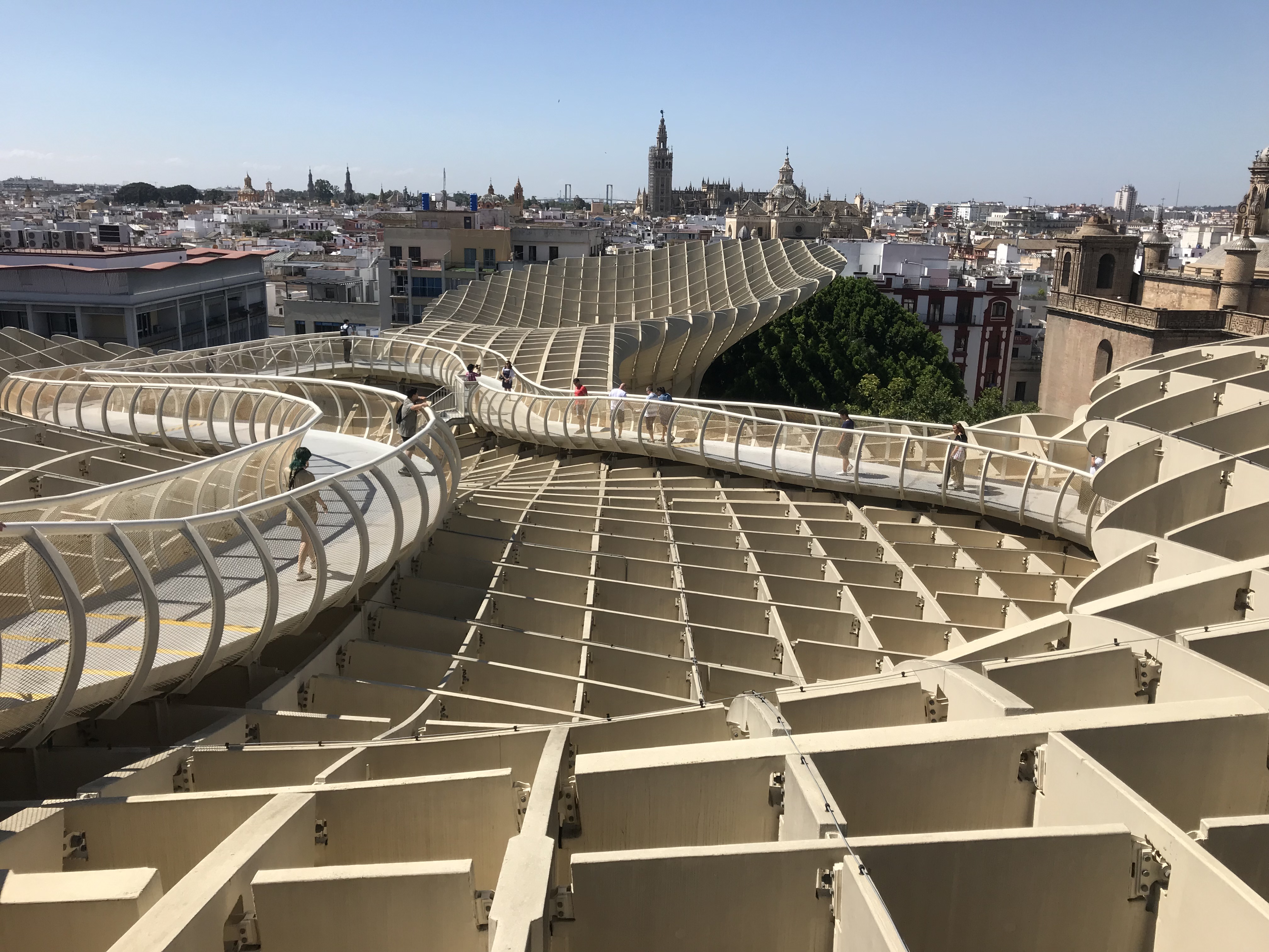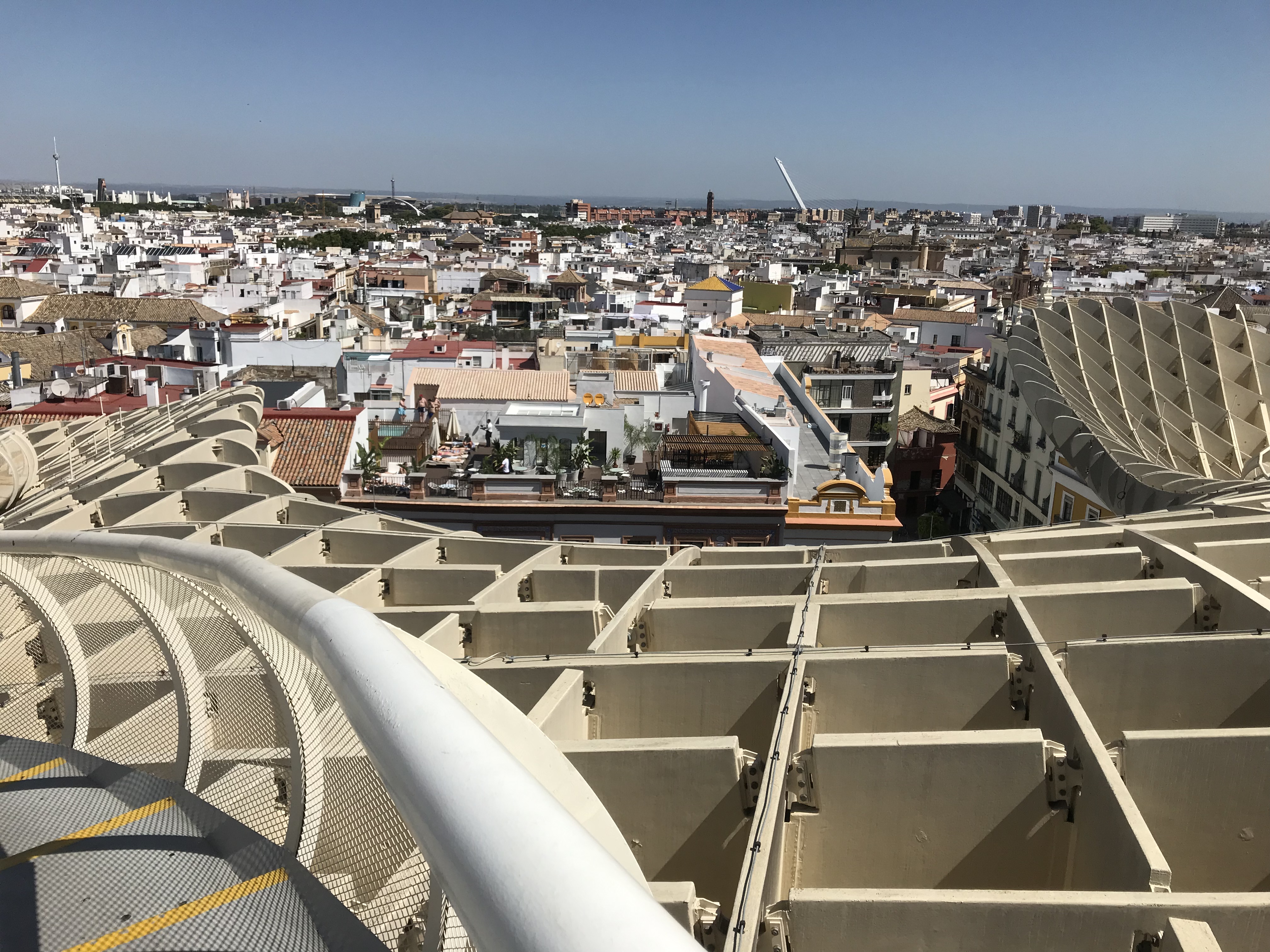 Ya cumplidos los objetivos del viaje, nos quedaba disfrutar de una soleada mañana de domingo sin planes establecidos así que aprovechamos para subir a las Setas de Sevilla. Realmente se llama Metropol Parasol y es una estructura de madera y hormigón de 150 metros de largo y 26 de alto que ocupa casi por completo la Plaza de la Encarnación en el centro de Sevilla, a muy pocos metros de la popular confitería La Campana.