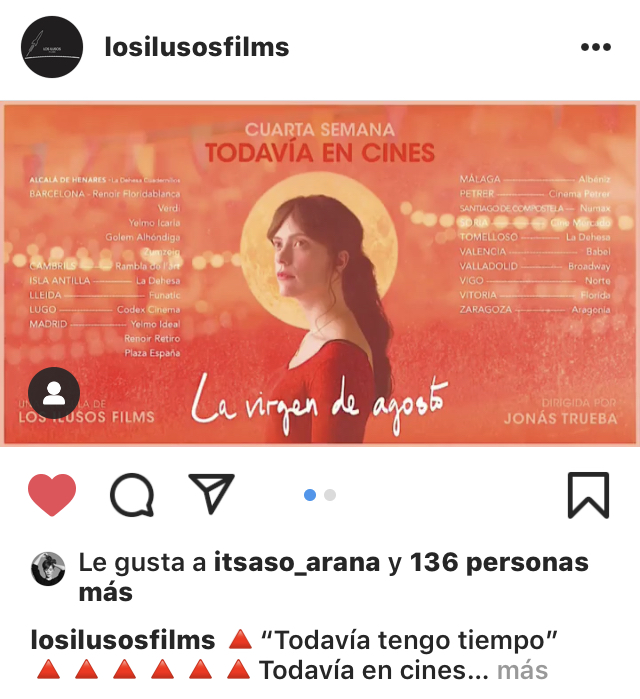 El viernes de la semana pasada, en Instagram, una publicación de los ilusos film nos recordaba que aún quedaba tiempo para ver la que, en mi opinión, es una de las películas españolas del año. Una de esas las llamadas pequeñas, independientes y de corto alcance que va ganando adeptos a medida que gente tiene la oportunidad de verla y recomendarla. En el mes de agosto se estrenó, precisamente en la semana que se celebran las fiestas patronales de Madrid, La Virgen de Agosto de Jonás Trueba.