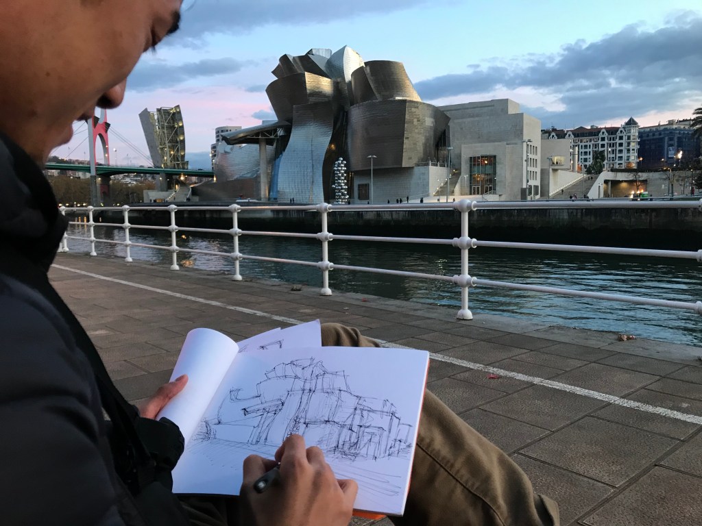Al salir hice unas 300.000 fotos al entorno. El conjunto con el puente de las Salve, construido en los años 70 y mejorado con una gran puerta roja del artista francés Daniel Buren, me parece un espectáculo y siempre distinto dependiendo de la hora del día en que lo observes. De camino al hotel encontré a un chico oriental haciéndole un dibujo al edificio y le pedí hacerle una foto, pues le estaba quedando fenomenal.