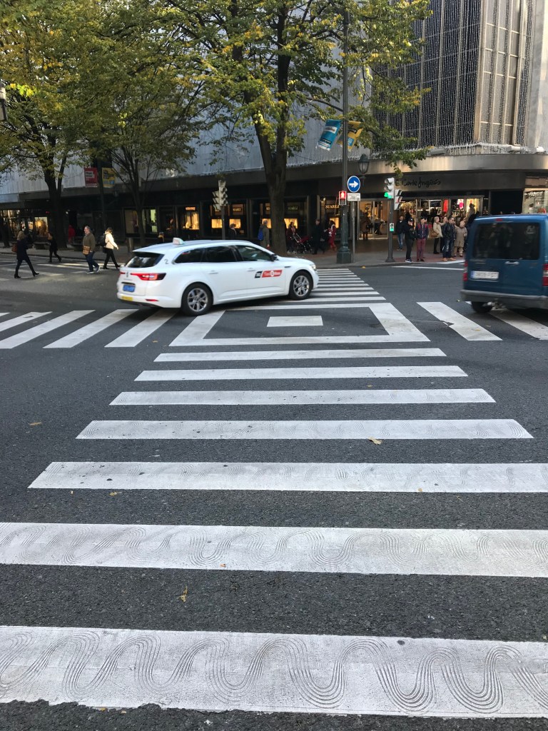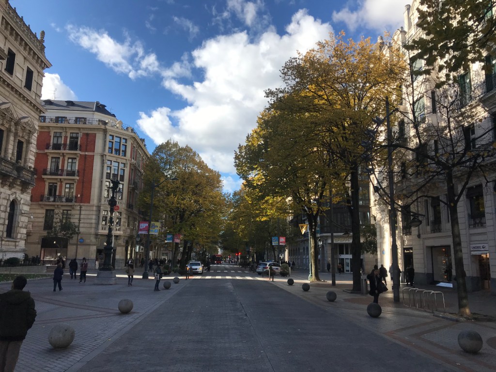 El primer paseo me llevó a cruzar el puente Zubizuri ideado por Calatrava (que ya no patina por tener una conveniente moqueta plástica) para llegar a la Gran Vía de Don Diego López de Haro, una de las calles más elegantes de nuestro país, donde está la sede de la entidad que toma el nombre de la ciudad y que es especialmente agradable por los árboles que encontramos en cada una de las aceras. Hay un cruce de cebra, en cruz, que me recuerda al de Shibuya en Japón, pero conociendo a los Bilbaínos, estoy seguro que los japoneses se lo copiaron.
