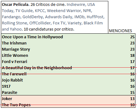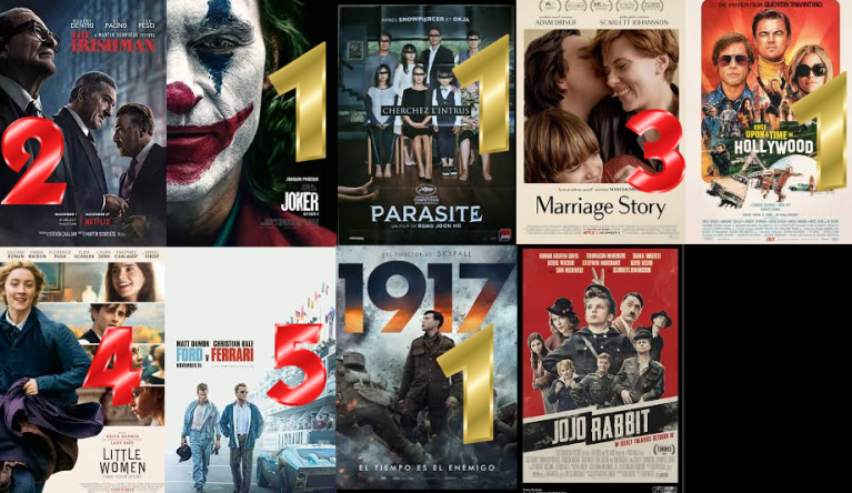 Para la película voy a utilizar mi tradicional cuadro con numeritos pero con una diferencia: no tengo favoritos, pues hay cuatro películas que este año me parecen imprescindibles. Me queda ver Jojo Rabbit pero creo que el premio estará entre las 4 marcadas con ese 1 color oro: cualquiera de ellas podría ganar.