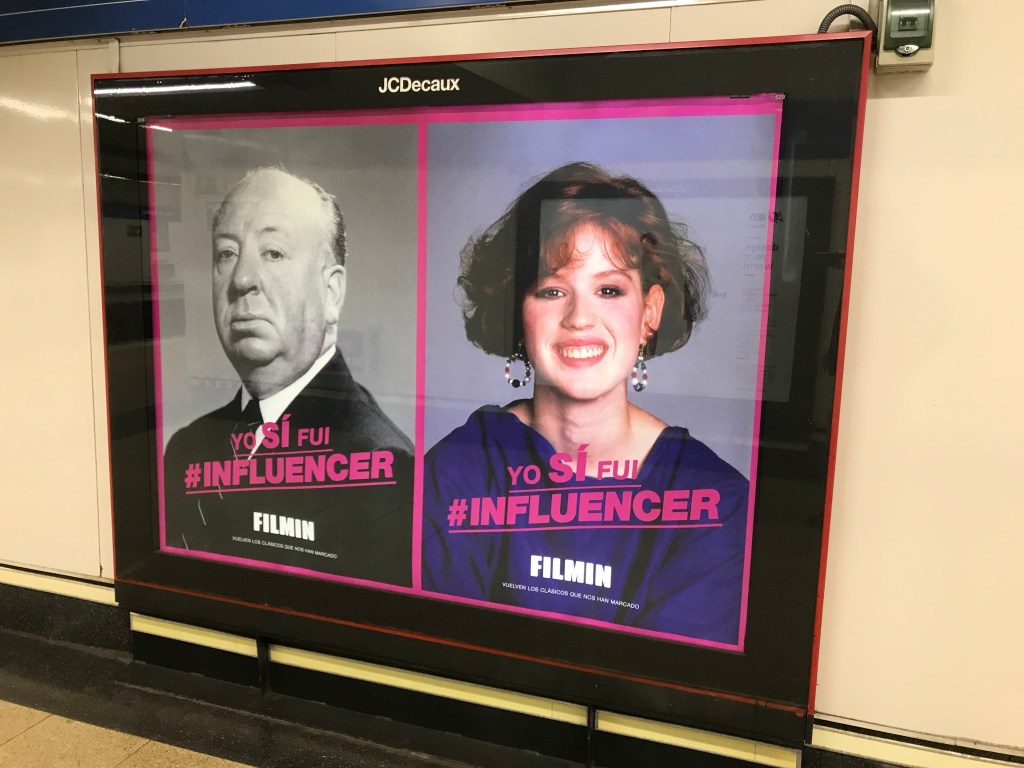 En el cartel vemos a Alfred Hitchcock y a Molly Ringwald, la eterna chica de rosa, con un texto que dice “Yo sí fui #INFLUENCER” con el que dan a entender la trascendencia que ambos tuvieron ambos, en diferentes momentos, dentro de la cultura popular del siglo XX. El director inglés es reivindicado siempre, su cine es un género en sí mismo y hasta se ha convertido en adjetivo. Ella no es tan popular para el público en general, sobre todo el más joven, pero tiene su rincón en el corazón de todos los que vivimos la adolescencia en la última veintena del siglo pasado.