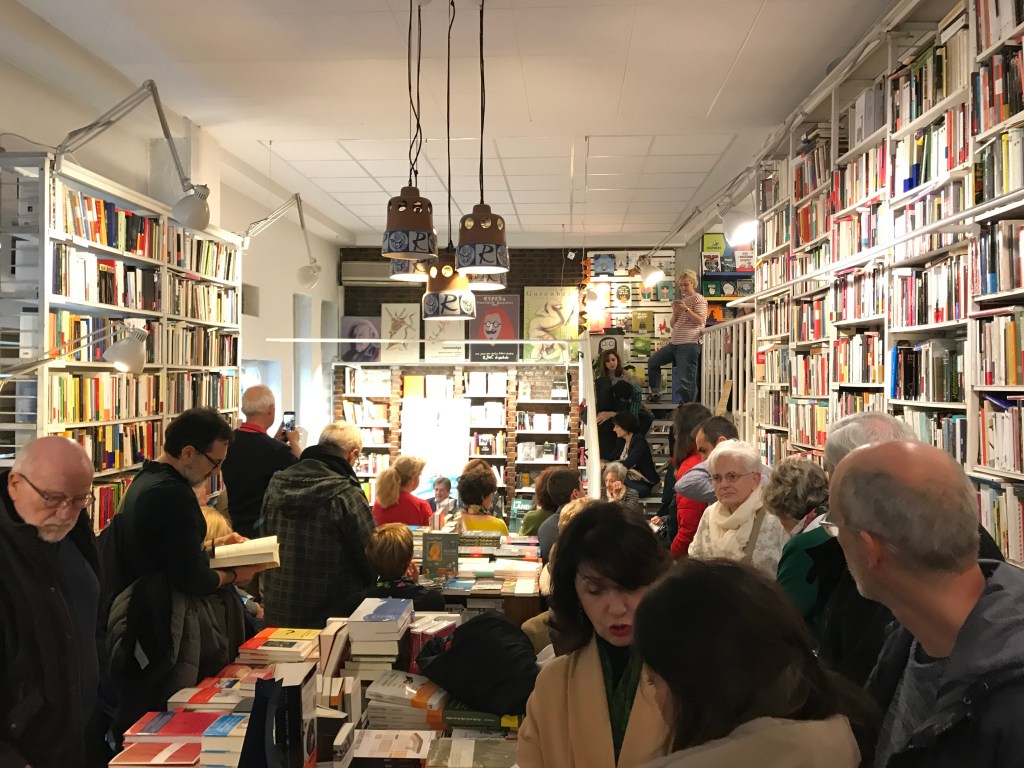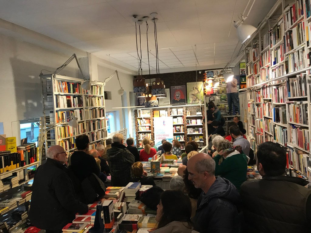Una fachada decididamente setentera esconde una librería ajena a todas las modas, el encanto que tiene es precisamente no tener otro que estar llena hasta la bandera de libros. Las tres veces que he estado (la vergüenza me carcome) he alucinado, es un lugar para estar horas, horas y horas hojeando y descubriendo nuevas obras. Las fotos son mías del día de la presentación que os he comentado más arriba pero, las hay mucho mejores (que no usaré porque no tengo permiso) si buscáis en google el nombre de la librería.