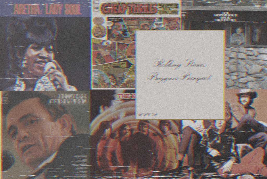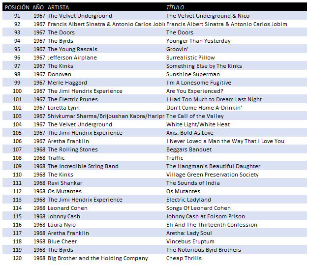 Tras Aretha, cambiamos de año y empezamos 1968 con los Rolling Stones y su Beggars Banquet. Un buen número de temas que ya son clásicos (¡Simpathy for the devil!) para seguir con Traffic y The Kinks, de los que el libro cuenta maravillas. Después del tedio absoluto con The Incredible Sting Band y otra vez música hindú con Ravi Shankar, un poco de alegría con los brasileños Os Mutantes, que sólo por A Minha Menina merecen la pena.