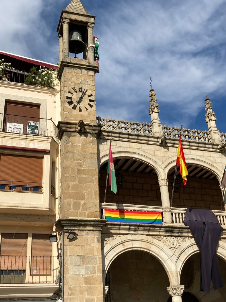 El resto de la tarde lo pasé paseando por Plasencia y descubriendo la ciudad. En la semana del orgullo gay la bandera ocupaba parte del balcón del ayuntamiento, cosa que aplaudo, pero ni la bandera ni los lazos pueden quitar protagonismo al verdadero reclamo de la fachada: el Abuelo Mayorga situado junto a la torre del palacio municipal. Aquí os dejo como conocer su historia.