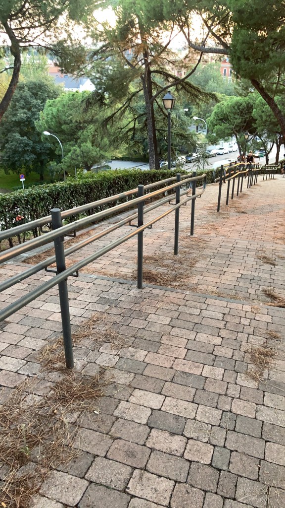 Justo debajo encontramos el escudo más antiguo de la capital datado el siglo XVII. Tuve que buscar en internet que era ese monumento adosado a lo que antes era La Casa del Pastor. El viaducto tiene a sus pies una de las zonas verdes con más encanto de la ciudad. Recomiendo caminar por dentro del parque Atenas que en otoño tendrá un color espacial y girar la cabeza de tanto en tanto para ver una de las mejores perspectivas de la Catedral de la Almudena.