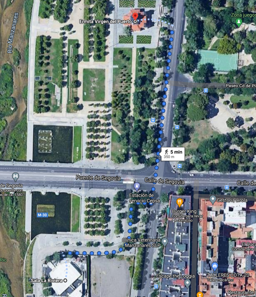 Ya en al Madrid Rio tenemos a un lado de al calle a La Riviera, una sala de conciertos que no será la mejor de Madrid pero en la que he vivido conciertos memorables como los de Miss Caffeina, Fangoria, Scissor Sisters o Rick Astley y al otro, vaya parece una señal, La Ermita de la Virgen del Puerto que da nombre al paseo y que debe ser uno de los edificios que más ha ganado en visibilidad desde el soterramiento de la ¿alguien se acuerda? M-30.