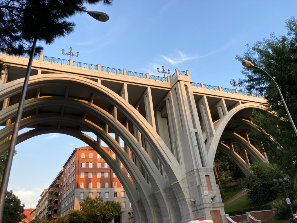 Bajar la calle Segovia es como cambiar de ciudad. Su acera estrecha no nos permite más movimiento que caminar de frente y mirar el impresionante viaducto, también llamado puente de los suicidas, una de las muchas postales que tiene la ciudad. Levantado en 1930 sirve para salvar el desnivel que provoca en la calle Bailen la de Segovia. Aparece en películas como Los amantes pasajeros (Pedro Almodóvar) o La virgen de agosto (Jonas Trueba) y celebro no encontrar una lista que alimente la morbosidad comentando quienes se han despedido de la vida allí.