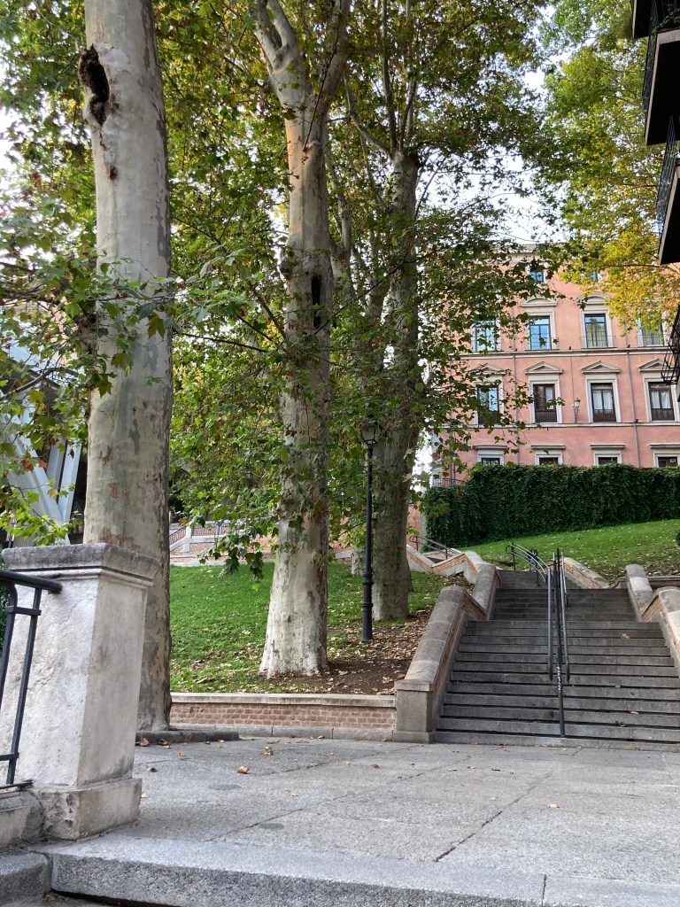 Me encontré allí con patos, pavos reales y una terracita donde tomar un refrigerio frente a un marco incomparable. Cuesta creer que un paraíso así se encuentre tan en el centro de la ciudad. Nuestro trayecto acabará en la Plaza de España a la que llegaremos subiendo la cuesta de San Vicente hasta las obras que la están remodelando. Hoy todo aquello es algo aparatoso y la pandemia ha hecho que tráfico no sea el normal pero cuando quede acabado el proyecto de unir el parque de oeste, la plaza y el entorno del Palacio Real, se podrá andar en un entorno natural recorriendo varios kilómetros. Será espectacular porque todas las zonas verdes quedarán mas o menos conectadas.