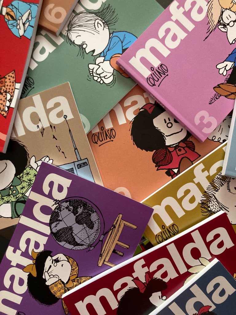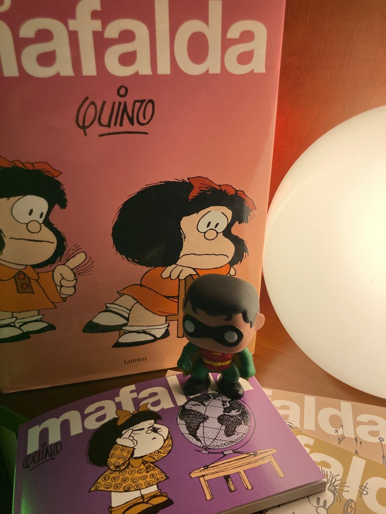 Me ha sorprendido que me dijeran que Mafalda era de cuando yo era pequeño. Ella y sus amigos dejaron de aparecer en tiras nuevas en 1976 y yo empezaría a leerlas, recopiladas, 12 años después y hoy me ya parece atemporal. La infantilización y apropiación de los personajes que se hizo en los años 80, cuando se imprimían en pijamas, camisetas o pegatinas con la bandera de España para ponerlas en el coche, darían mucho dinero, pero hicieron poco favor (lo mismo que a los pobres Snoopy y Carlitos) a la obra en sí y hay algunos que han colocado estas historietas en un lugar que no le corresponde, como si fuera, yo que sé, por supuesto con todo mi respeto, Tintín, que me encanta pero que es para todo tipo de lector.