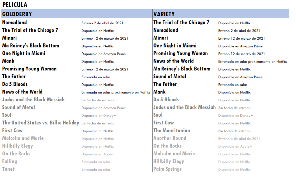 Desde hace muchos meses se viene hablando de las posibles nominadas y algunas han permanecido inamovibles dentro de las 15 primeras a tener alguna oportunidad y habrá que esperar al último minuto pues están surgiendo sorpresas cada dos minutos. Hace dos meses Promising Young Woman y Malcom & Marie ni aparecían en las quinielas o Hillbilly Elegy era de las mejor posicionadas. Nomadland, Mank y The Trial of Chicago 7 llevan entre las primeras desde hace muchos meses y tienen casi asegurada la nominación. He tomado las preferencias de un par de webs acreditadas (casi siempre aciertan) para ver cómo anda la cosa después de las ya conocidas nominaciones a Globos de Oro, premios del sindicato de actores y otros premios menores cuyas candidaturas ya se han empezado a conocer. De acuerdo a Goldderby y Variety, las mejor posicionadas son…