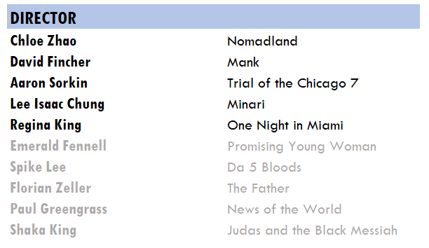 En los Globos de Oro ha sido un bombazo que haya tres directoras entre las nominaciones a mejor director. Con el buen posicionamiento que está consiguiendo Promising Young Woman es algo que también podría pasar en los Oscars. La favorita desde hace meses es Chloe Zhao, que tiene pendiente Marvel’s Eternals, por Nomadland, la película del año en cuanto a festivales se refiere. Regina King y Emerald Fennell podrían acompañarla. Aaron Sorkin y Fincher tienen casi segura la nominación por sus dos peliculones.