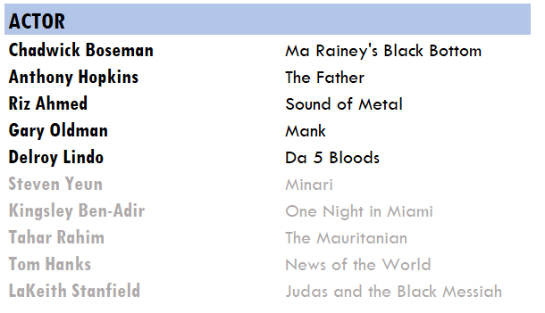 Se echa de menos una categoría dedicada al reparto al completo, de haberla habido podrían premiar al completo al equipo de actores de Trial of Chicago 7 pues todos lo merecerían. Aquí tenéis la segunda opción de Boseman en estos premios. No se entiendo lo de Bill Murray, protagonista de On The Rocks que ha sido presentado como secundario, cosas que pasan para obtener más oportunidades de premio.