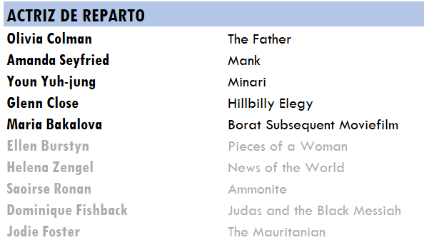 En cuanto el premio a la mejor actriz yo esperaba que mi adorada Amy Adams estuviera entre las 5 aspirantes por Hillbilly Elegy pero cada vez se va alejando más, va camino de convertirse en otra legendaria eterna nominada sin premio, como lo fue Leo DiCaprio o lo es Glen Close. Zendaya o Carey Mulligan son las que más están subiendo y quienes pueden hacer peligrar el premio, hasta ahora cantado, a Viola Davis o Frances McDormand. La película de la Loren ya está en Netflix y al igual que la de Vanessa Kirby, un dramón para el que hay que estar preparado. Es fantástico ver a Michelle Pfeiffer en la lista.