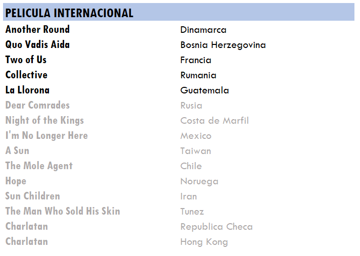 La lista corta, publicada estos días, ha dejado fuera la película española La Trinchera Infinita, triunfadora de los Goya pero quizás con un perfil muy local, como todas las que tienen la Guerra Civil de fondo. La danesa, que podría estar en otras categorías, y la guatemalteca podrían abrir y cerrar una lista que ya se da por segura en muchos foros.