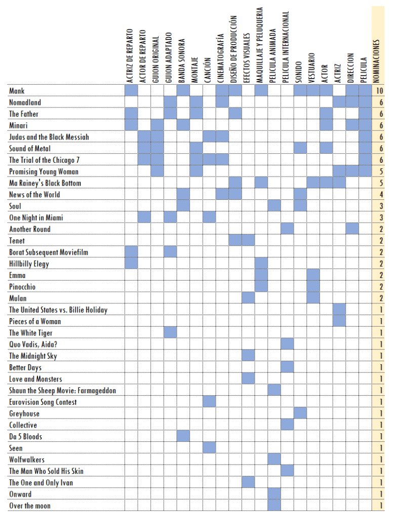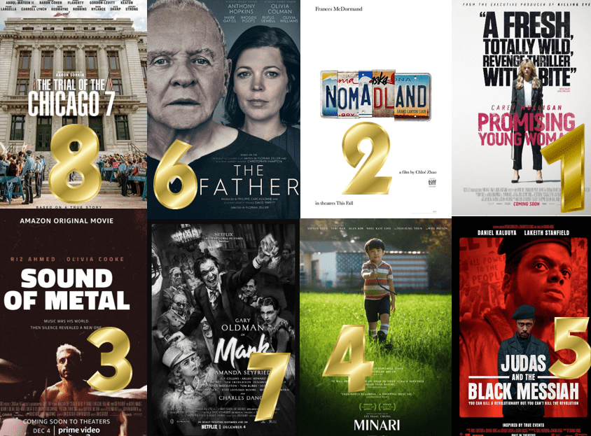Ni una decepción me he llevado este año, todas las películas me han gustado y aunque en las quinielas previas había alguna más, creo que se han quedado las que debían quedarse. Hay quien ha comentado que se trata de, en su mayoría, películas pequeñas, mas propias de circuitos de festivales pero, como dice el periodista Juan Sanguino, es lo que se ha estrenado y no se podía esperar más de un año en que los grandes estudios han dado la espalda a las salas de cine. Las grandes producciones como Dune o West Side Story no se han estrenado y tampoco lo han hecho otros blockbusters como La Viuda Negra o la última de James Bond así que el cine más independiente se lleva buena parte del pastel. Quizás sea Mank, con razón tiene 10 nominaciones, la más parecida a ese cine «de siempre» que encontramos en la lista.