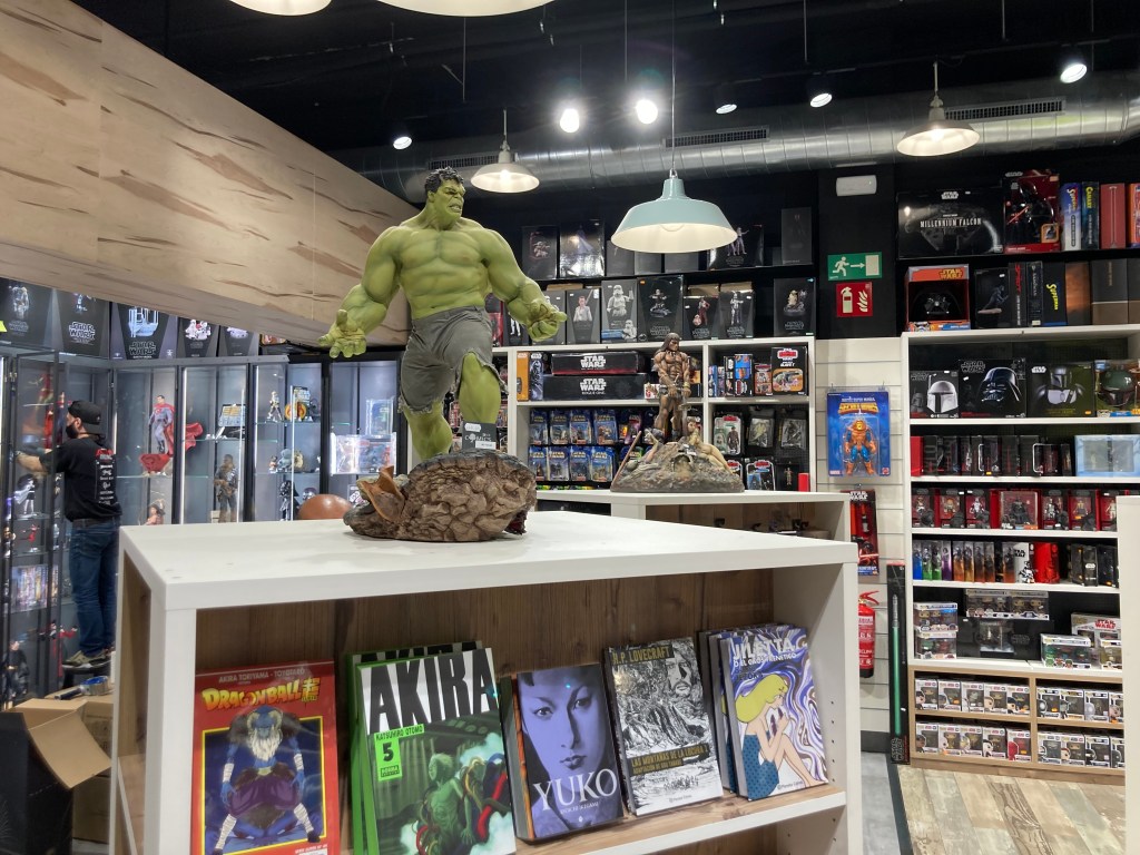 Si normalmente digo que tanto si te gustan o no, tienes que entrar en una librería de cómics porque merece la pena admirar el espectáculo visual, mucho más en este caso. Las fotos no hacen justicia. Es el lugar ideal para que un aficionado al cómic pase horas encerrado y embobado pensando, de tener el dinero, donde pondría esas gigantescas figuras. No sólo tienen el material que publica ECC sino de todas las editoriales así que aficionados a Marvel, DC, Manga o novela gráfica de corte adulto pueden encontrar fácilmente lo que buscan. Para pasar horas, las fotos no hacen justicia.